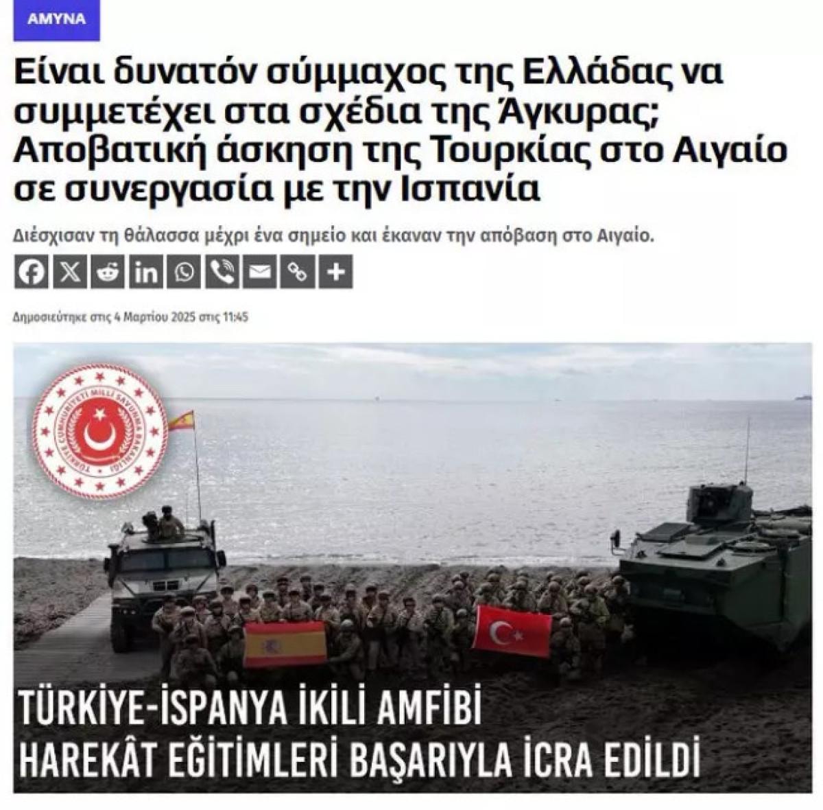 Türkiye ile yakın ilişkilerde bulunan İspanya’yı hedef alan Yunan basını 26 Şubat-1 Mart 2025 tarihleri arasında Ege Denizi’nde Doğanbey Tatbikat Bölgesi’nde Türkiye- İspanya İkili Amfibi Harekât Eğitimlerini tamamladı.