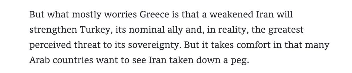 “Ancak Yunanistan’ı en çok endişelendiren şey, zayıflamış bir İran’ın nominal bir müttefiki ve gerçekte egemenliğine yönelik algılanan en büyük tehdit olan Türkiye’yi güçlendirecek olması. Ancak pek çok Arap ülkesinin İran'ın küçük düşürülmesini istemesi onu rahatlatıyor.”