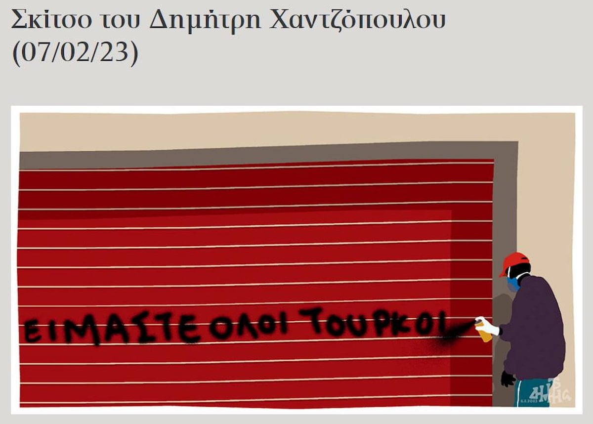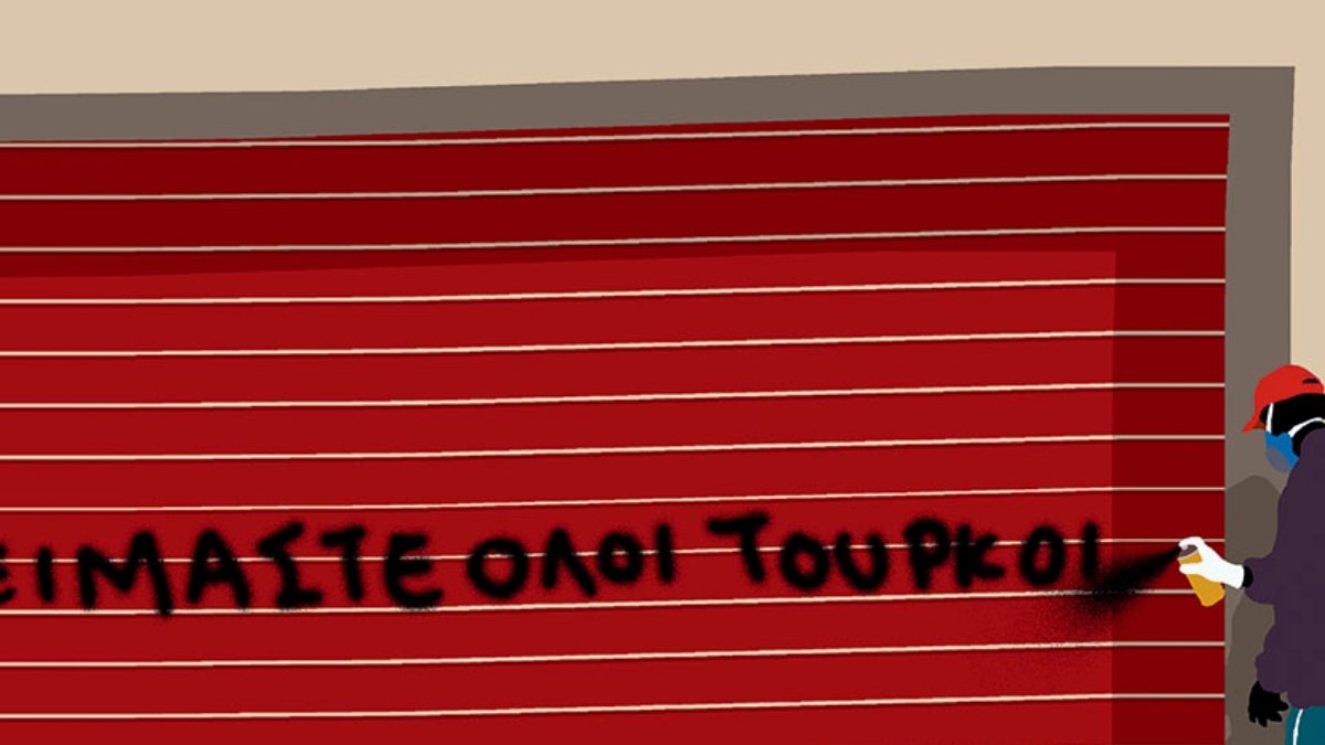 Kathimerini gazetesinin paylaştığı karikatürde, elinde sprey boya olan bir kişinin duvara "Hepimiz Türk'üz" ifadesini yazdığı anlar resmedildi.