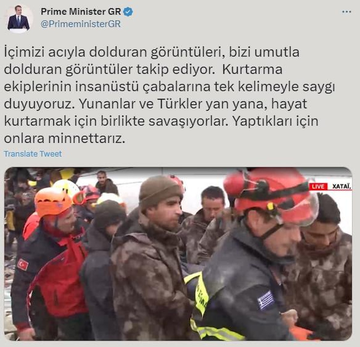 Miçotakis, Türkçe paylaşımında, "Yunanlar ve Türkler yan yana, hayat kurtarmak için birlikte savaşıyorlar. Yaptıkları için onlara minnettarız." dedi.