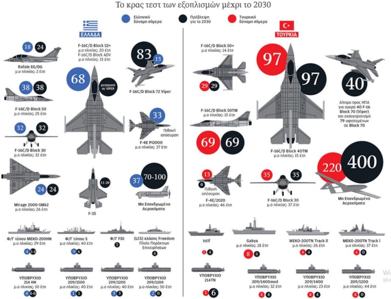 Yunan gazetesi Kathimerini, 2030 yılındaki Türk ve Yunan ordularının hava ve karadaki gücünü karşılaştıran bir haber yayınladı. Gazete, haberinde Türk ordusunun açık ara lider konumda olduğunu vurguladı.
