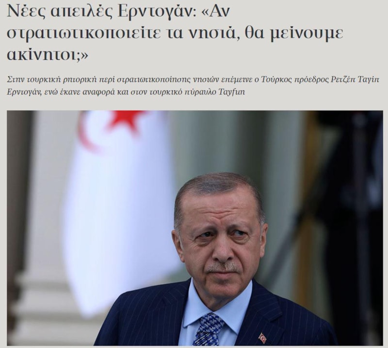 Kathimerini gazetesinin “Erdoğan’dan yeni tehditler: Adaları askerileştirirseniz, hareketsiz mi kalacağız?” başlıklı haberinde şöyle denildi: