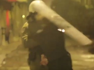 Protesto gösterileri sırasında Yunan polisler protestoculara adeta işkence yaptı. Kaydedilen görüntülerde bir Yunan polisin, protestocuyu kalkanıyla dövdüğü görülüyor.