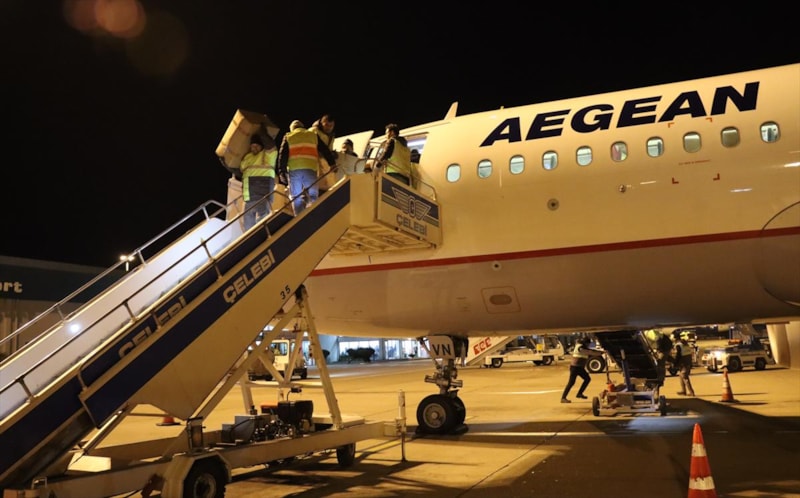 Yunanistan, Türkiye'ye iki uçakla insani yardım malzemesi gönderdi. Battaniye, yatak, barınma ve mobil muayenehane amaçlı çadırları taşıyan uçaklar, Adana Havalimanı'na indi.