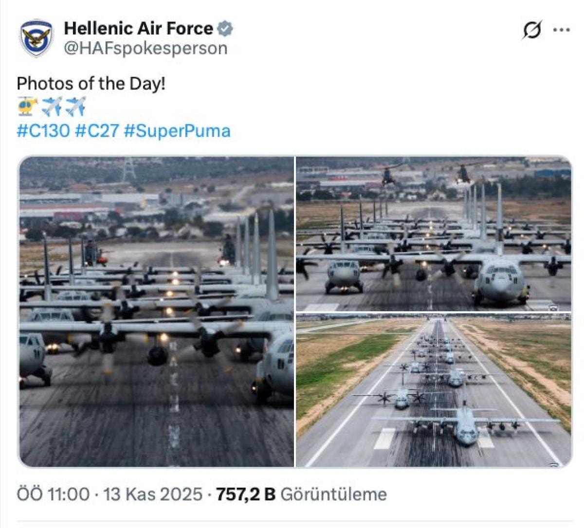 Resmi hesaptan yapılan paylaşımda, C-130 filosunun görsellerine yer verilerek, “Günün Fotoğrafları! #C130 #C27 #SuperPuma” notu düşüldü.