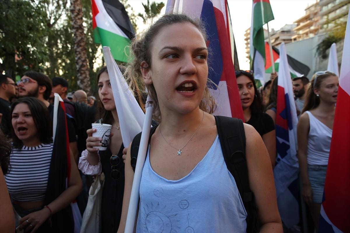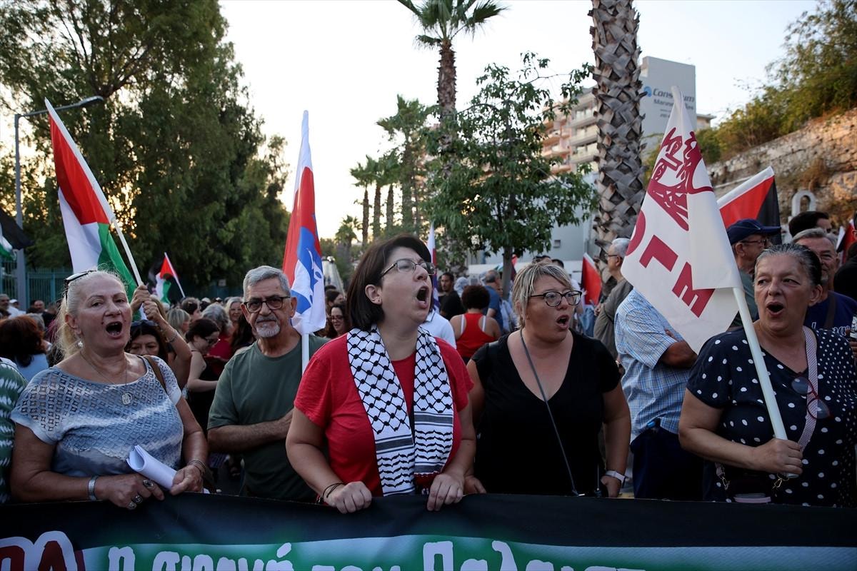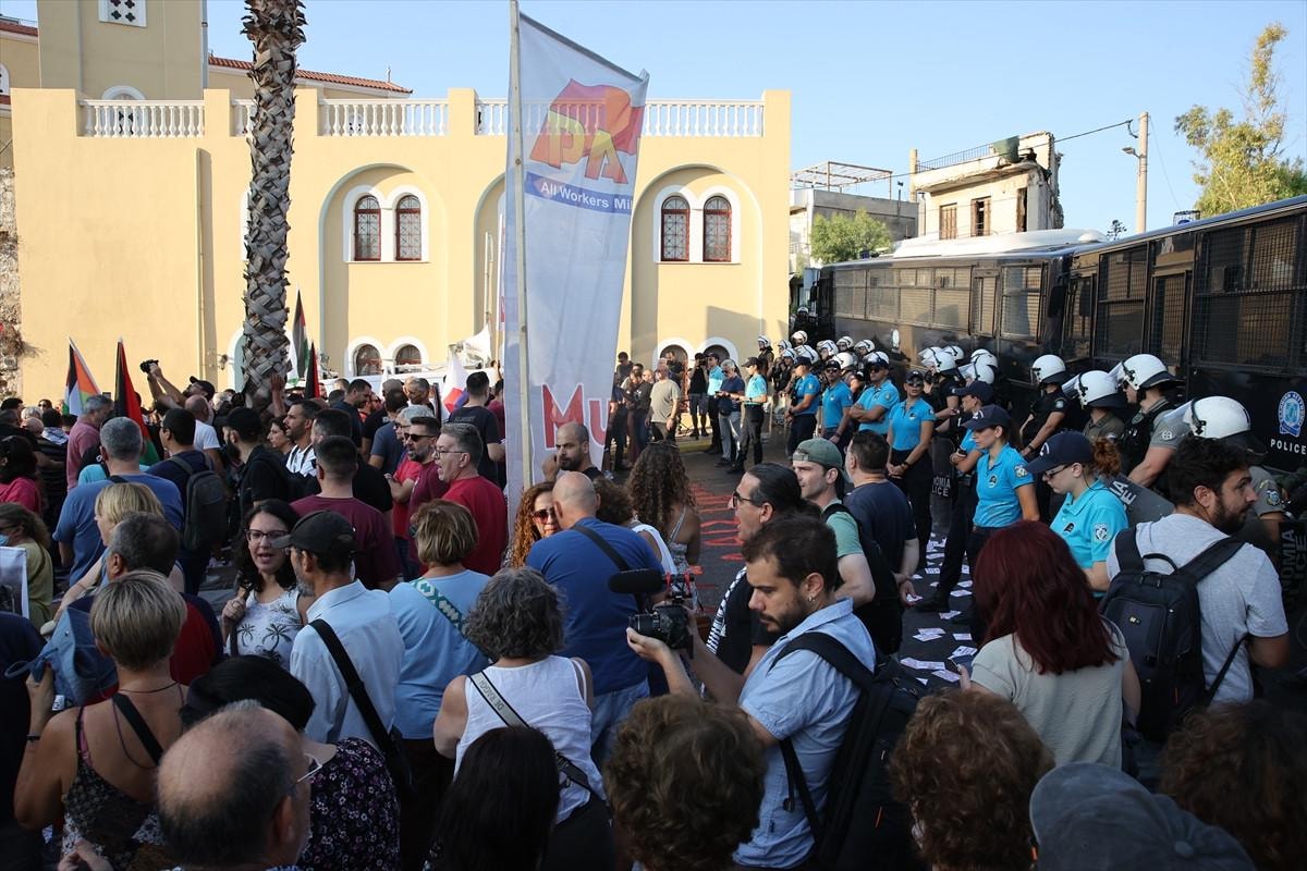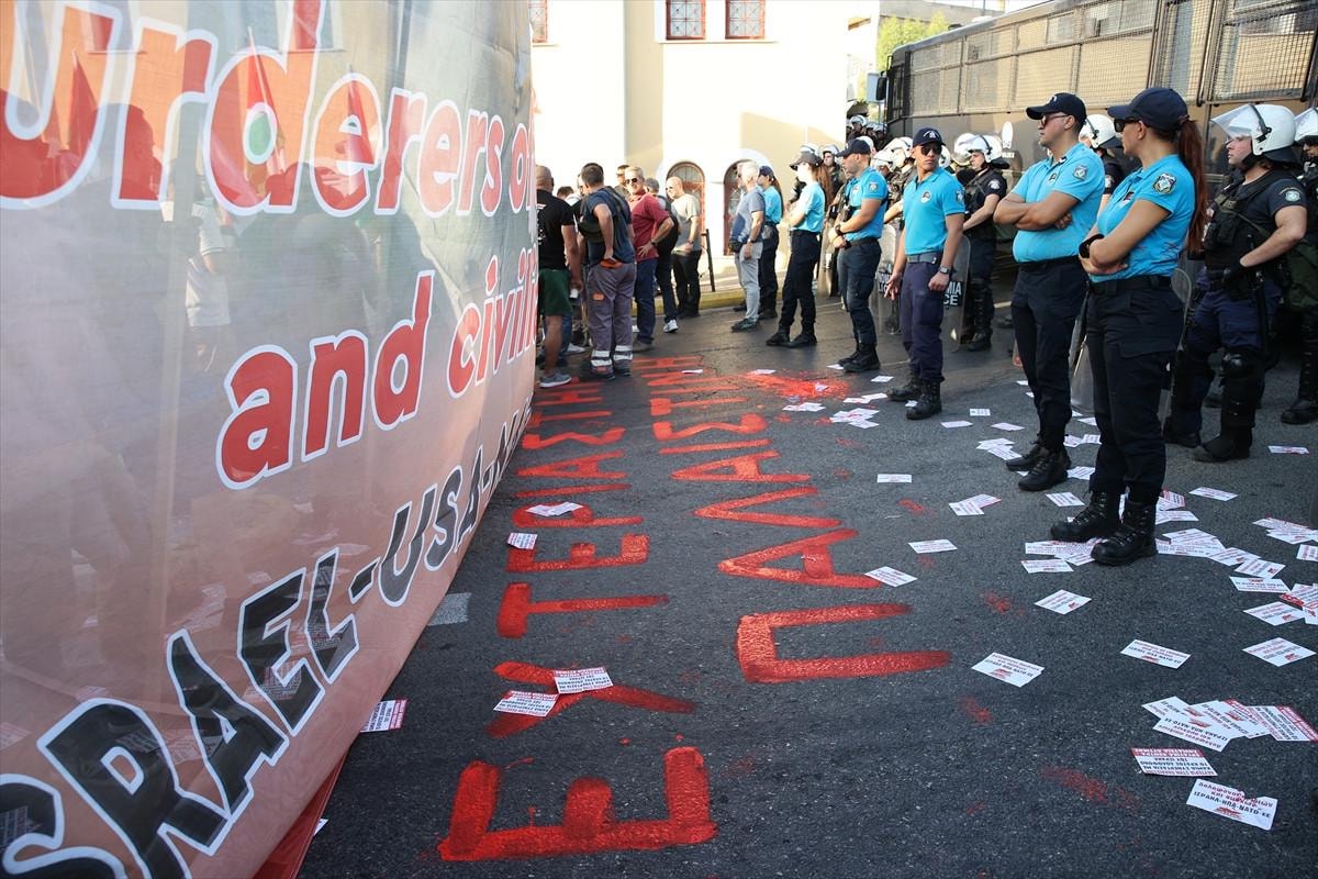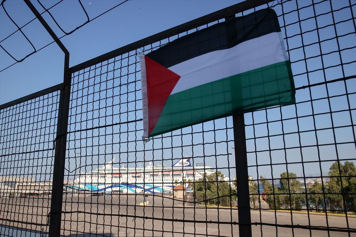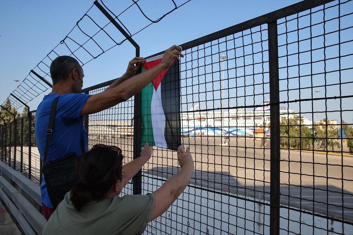 Yunanistan Komünist Partisi (KKE), çeşitli sol gruplar, sendikalar ile Filistin destekçisi aktivistlerden oluşan grup, İsrail'e ait gemideki yolcuların karaya çıkmasını engellemek amacıyla Pire Limanı'nda bir araya geldi.
