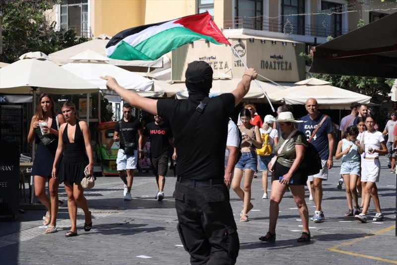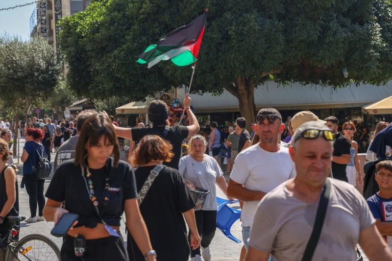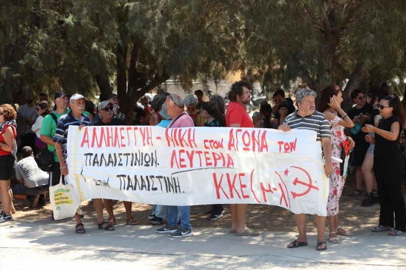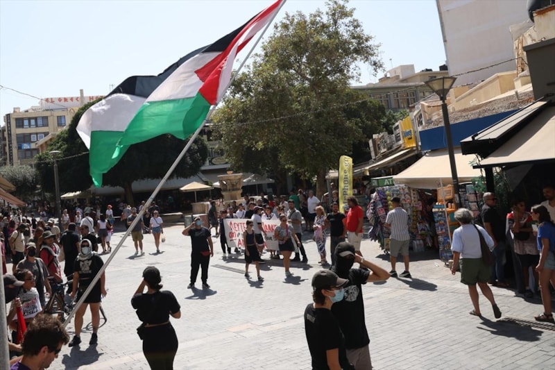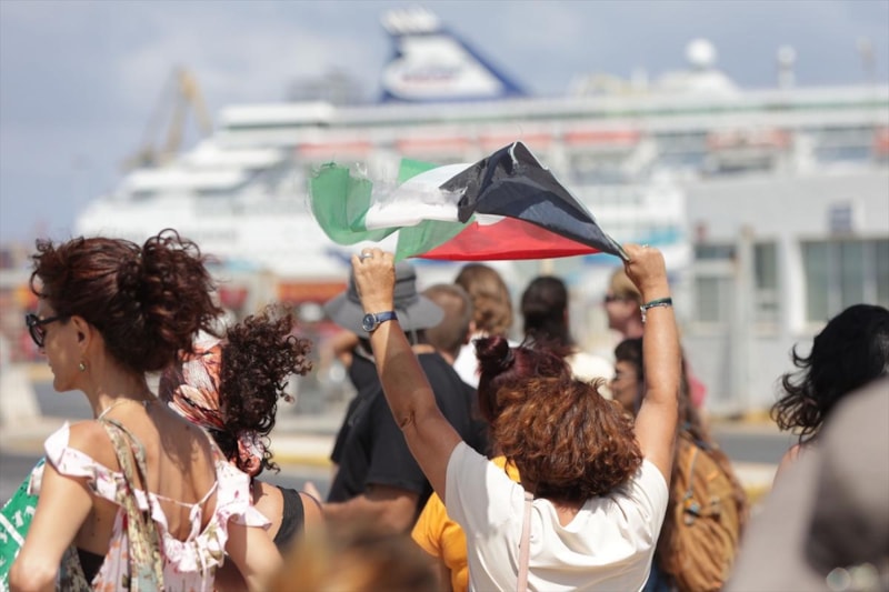 Yunanistan'da Girit Adası'ndaki Heraklion Limanı'nda, yaklaşık 1600 yolcu taşıyan geminin limana yanaşmasının ardından göstericiler pankartlar ve Filistin bayraklarıyla liman girişinde toplandı.