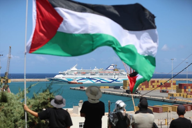Girit Adası'ndaki Heraklion Limanı'nda Filistin destekçileri, öğle saatlerinde limana demirleyen İsrail bandıralı Crown Iris kruvaziyeridekileri protesto etti.