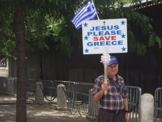 Yukarıdaki fotoğrafta bir Yunan vatandaşının taşıdığı döviz, ülke ekonomisinin durumunu özetliyor. "İsa lütfen kurtar bizi" yazılı pankart, ekonomik açıdan batık seviyesine inen Yunanistan'ın düzlüğe çıkmasının zorluğunu anlatıyor.