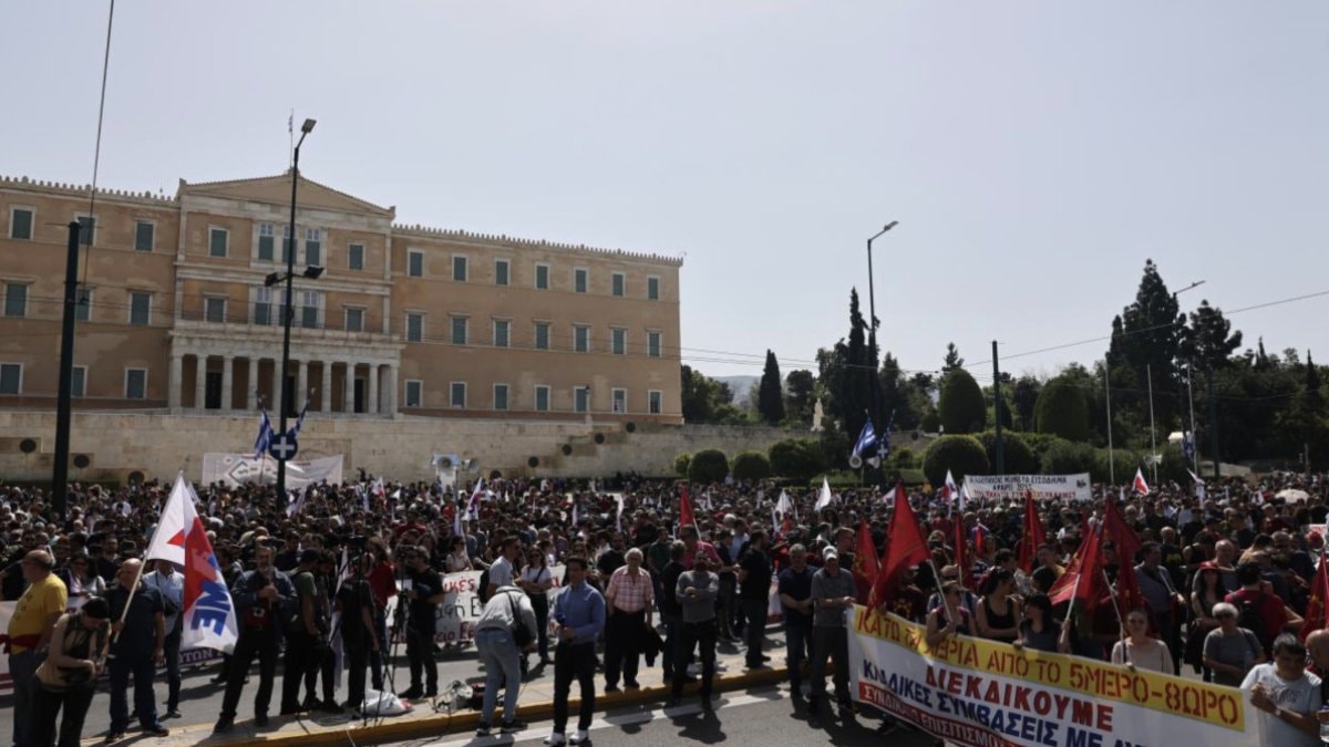 Grev çerçevesinde işçiler, başkent Atina'da eylem düzenledi. Gösteride maaş artışı ve toplu iş sözleşmesi gibi taleplerini dile getiren işçiler, Parlamento binasına yürüdü.