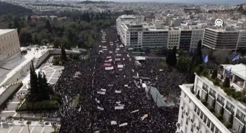 Kazada yakınlarını kaybeden ailelerin öncülük ettiği gösteriye, Atina’da birçok iş yeri kepenk indirerek destek verdi.