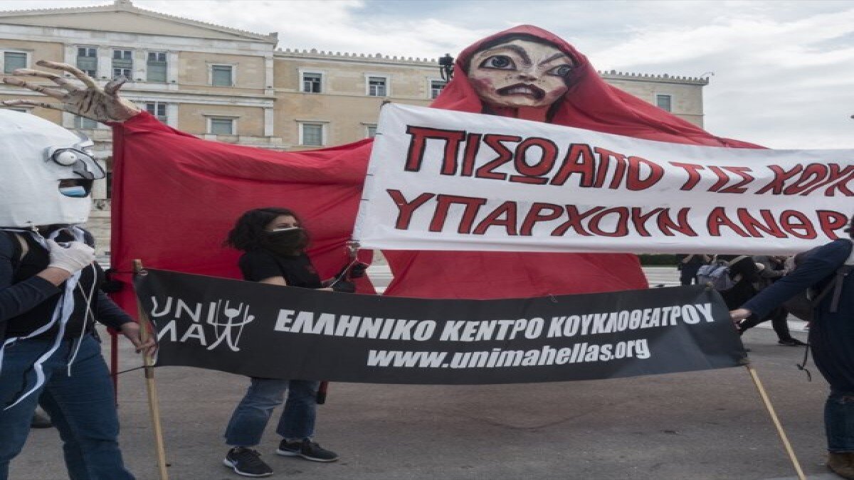 "Maske takıyoruz ama susmuyoruz'' sloganı ile parlamento binasının da bulunduğu Sintagma Meydanı'nda bir araya gelen müzisyen, oyuncu, yazar ve ressamlardan oluşan yüzlerce kişi, farklı kostümleriyle ''medeniyet susturulamaz'', "medeniyet ancak insanlar kurtulduğunda kurtulur'', ''sanat, sıcak ekmek gibidir'' yazılı pankartlar taşıdı.