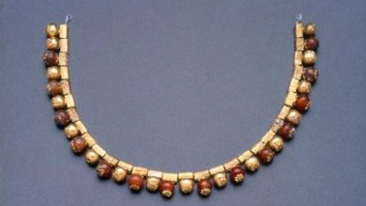 Lidya sanatının karakteristik özelliklerini taşıyan ve yaklaşık 20 santimetre uzunluğundaki eseri, altın ve karnelyan taşlarından oluşan nar şeklinde boncuklar süslüyor.