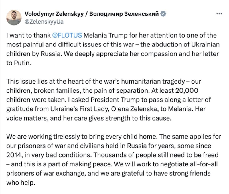 Ukrayna Devlet Başkanı Vladimir Zelenskiy, ABD Başkanı Donald Trump'un eşi Melania Trump’a Rusya tarafından kaçırılan Ukraynalı çocuklar konusuna gösterdiği ilgi için teşekkür ederek, "Merhamet Putin’e yazdığı mektubu derin takdirle karşılıyoruz" dedi.