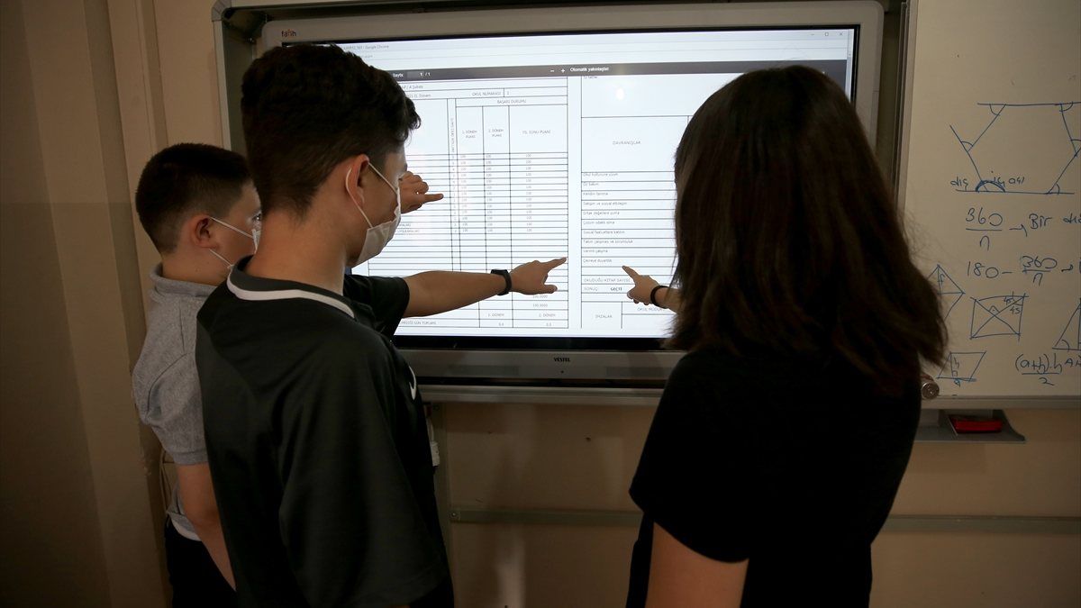 Eğitim öğretime devam eden öğrenciler okullarında akıllı tahtalardan karnelerini inceledi. Öğrenciler, heyecanla bir birlerinin ders notlarına baktı.