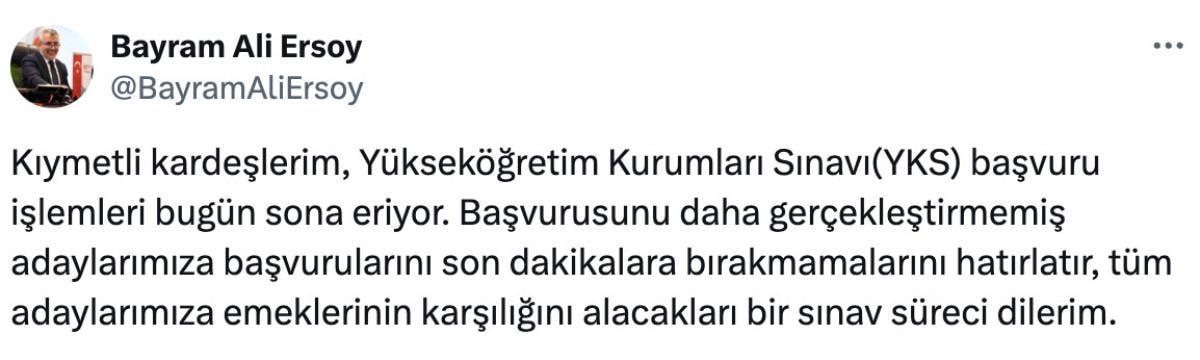 Kıymetli kardeşlerim, YKS başvuru işlemleri bugün sona eriyor. Başvurusunu daha gerçekleştirmemiş adaylarımıza başvurularını son dakikalara bırakmamalarını hatırlatır, tüm adaylarımıza emeklerinin karşılığını alacakları bir sınav süreci dilerim."