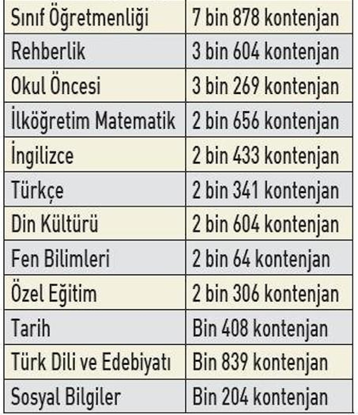 En fazla kontenjan ayrılan branşlar şu şekilde: