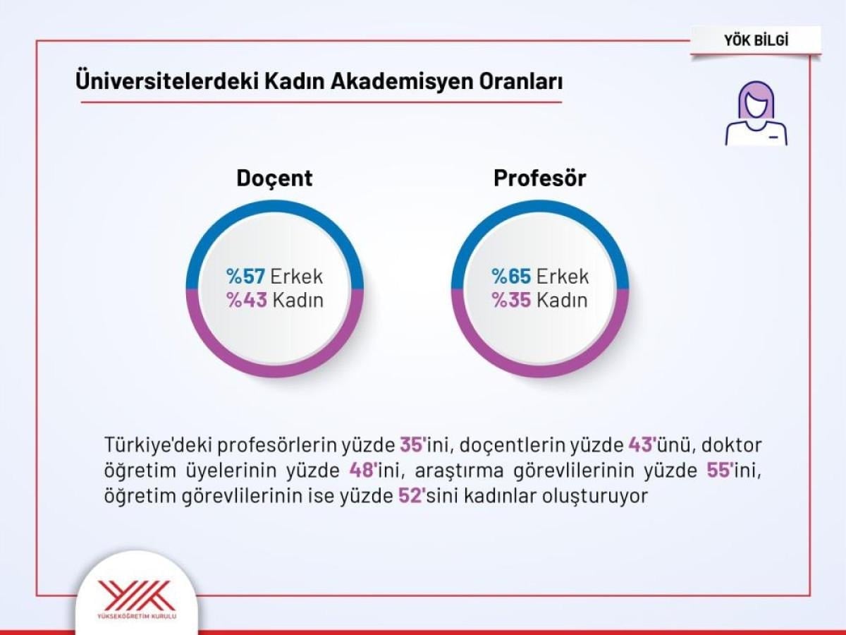 Türkiye'deki üniversitelerde profesörlerin yüzde 35'ini, doçentlerin yüzde 43'ünü, doktor öğretim üyelerinin ise yüzde 48'ini yine kadınlar teşkil ediyor.