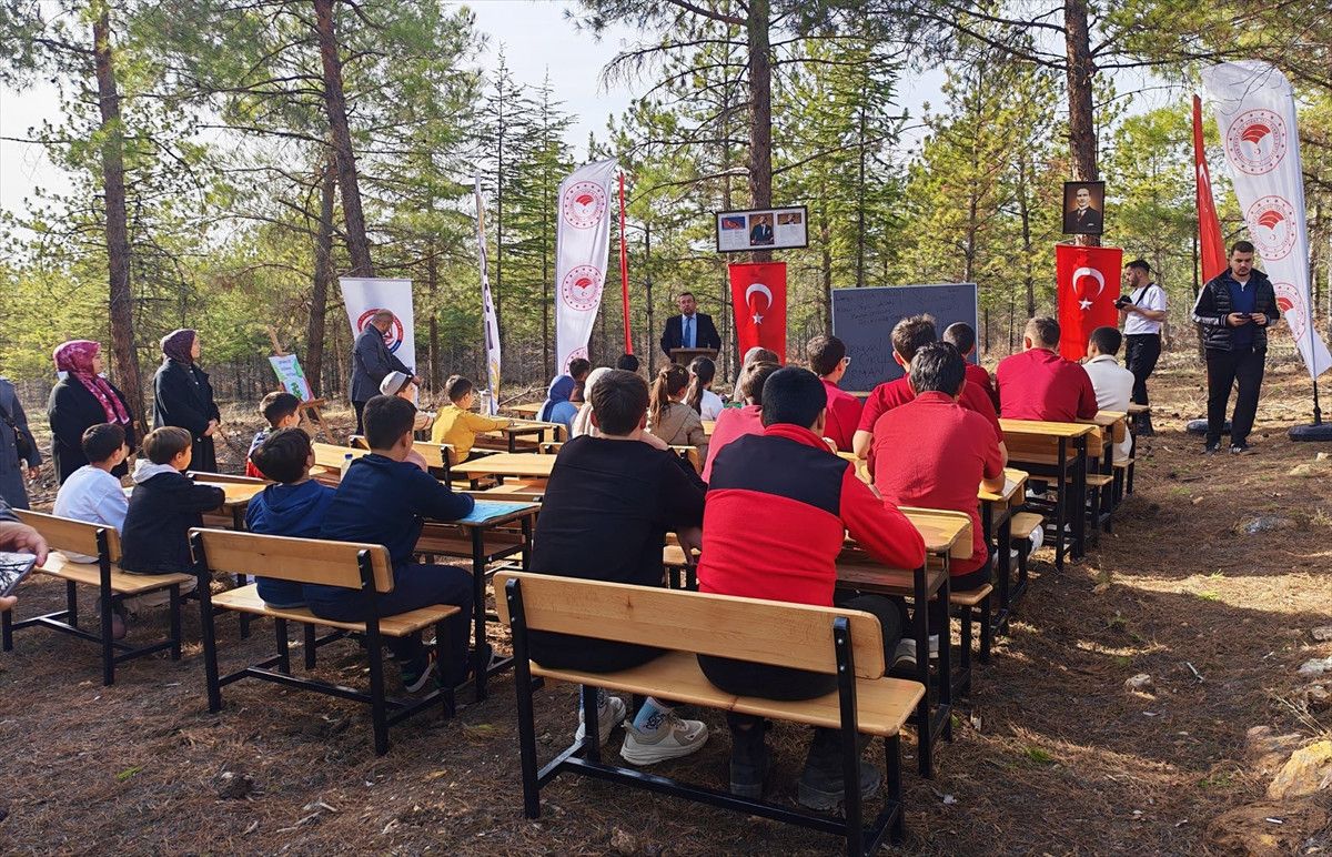 Kızılbayır mevkisindeki ormanlık alana gelen öğrenciler, Türk bayraklarıyla süslenen ve sıraların yerleştirildiği özel alanda ders işledi.