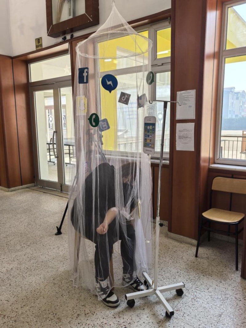 Sanal bir dünya kurduk ve farkında olmadan gerçek hayattan uzaklaşmaya başladık. Öğrencilerimizin, öğretmenlerimizin ve toplumun bu bağımlılığın farkına varmasını sağlamak istedik. 17 sahneden oluşan bu sergimizde öğrencilerimiz canlı manken olarak yer aldı. Sahnelere biraz ironi, biraz komedi ve biraz da abartı kattık ama hepsi gerçeklerden ilham alındı. Amacımız, hepimizin bu konuda bilinçlenmesi ve bağımlılıktan kurtulma adına bir adım atmasıydı.