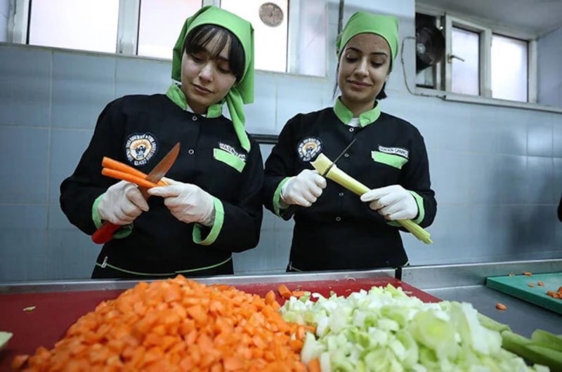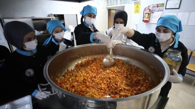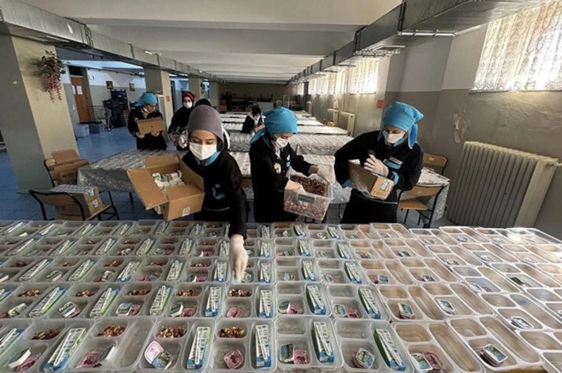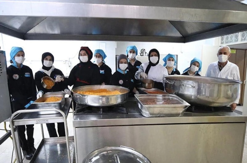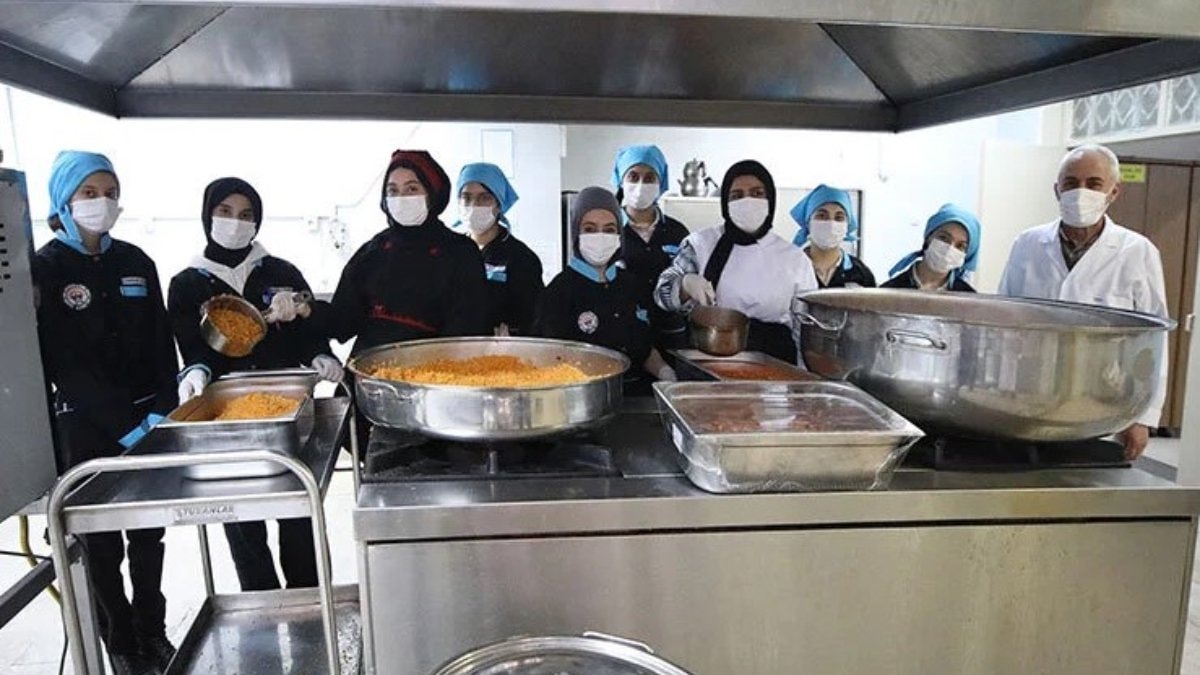 Kız meslek lisesi öğrencileri, Milli Eğitim Bakanlığının deprem bölgesi illerde başlattığı Beslenme Desteği Projesi kapsamında 1400 anaokulu öğrencisine günlük kahvaltı ve yemek hazırlıyor.