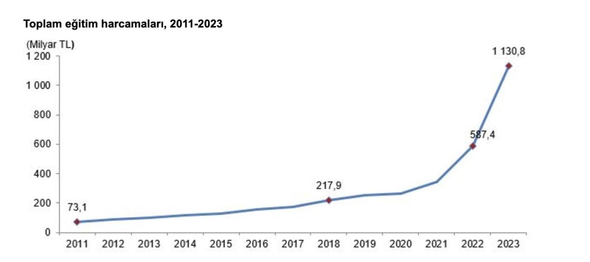 Eğitim harcamaları 2023 yılında 2022 yılına göre yüzde 92,5 artarak 1 trilyon 130 milyar 844 milyon TL oldu.