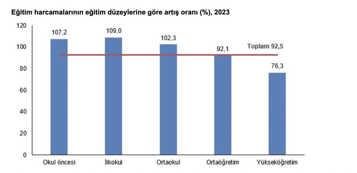 Bir önceki yıla göre eğitim harcamalarının en fazla arttığı eğitim düzeyleri 2023 yılında; yüzde 109 ile ilkokul ve yüzde 107,2 ile okul öncesi oldu.