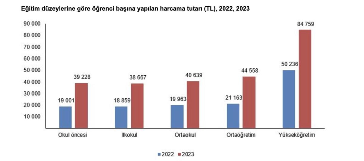 Öğrenci başına yapılan eğitim harcaması 2022 yılında 25 bin 143 TL iken, 2023 yılında 49 bin 45 TL olarak gerçekleşti. Eğitim düzeylerine göre değerlendirildiğinde, 2023 yılında öğrenci başına harcamanın en yüksek olduğu eğitim düzeyi 84 bin 759 TL ile yükseköğretim oldu.
