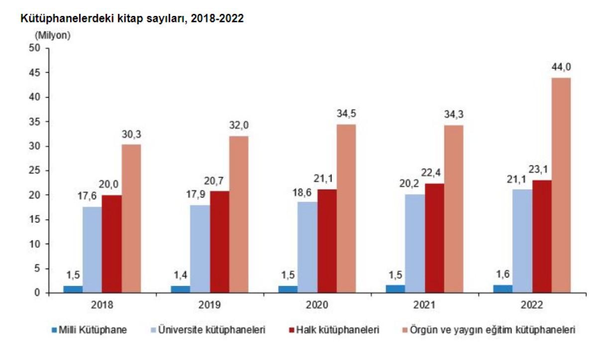 Geçen yıl kütüphane sayısı 1 Milli Kütüphane, 1.257 halk kütüphanesi, 625 üniversite kütüphanesi ve 47 bin 654 örgün ve yaygın eğitim kurumu kütüphanesi olmak üzere toplam 49 bin 537 oldu.