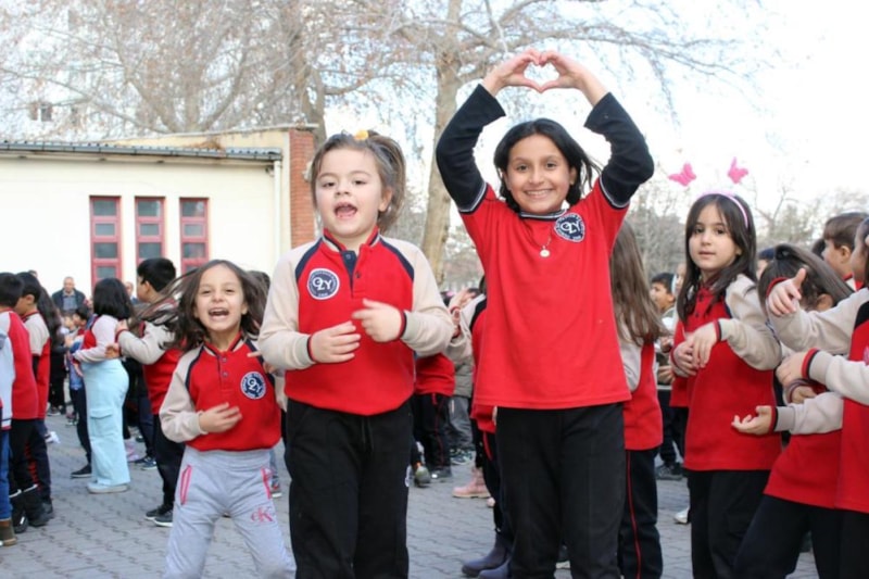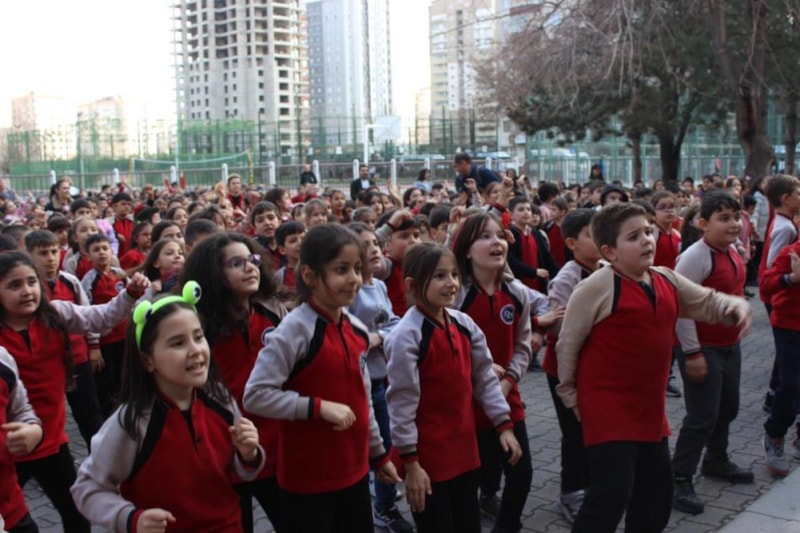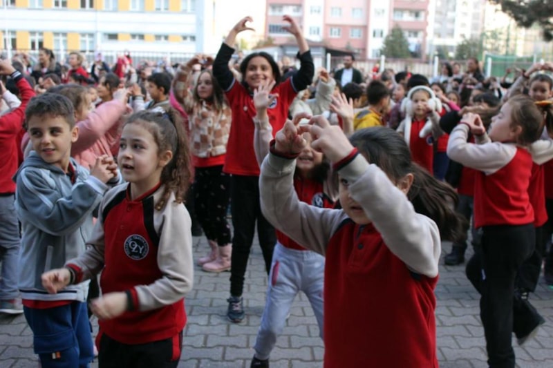 Osman Zeki Yücesan İlkokulu'nda ders öncesi öğrenciler müzik eşliğinde dans edip kültür fizik hareketleri yapıyor.