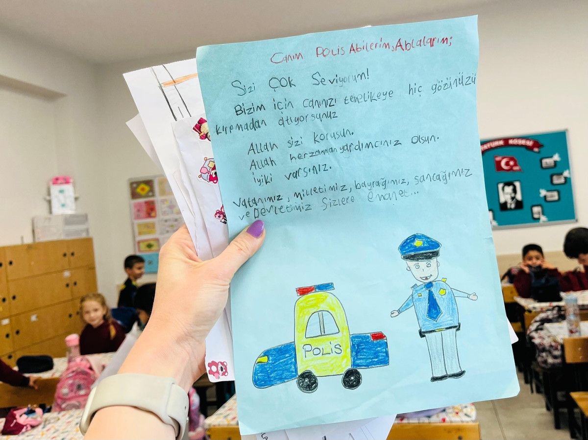 Eğitim sonunda öğrenciler, polis abi ve ablalarına olan sevgilerini şiirler ve resimler ile dile getirdi. Miniklerin hazırladığı bu anlamlı sürpriz, etkinliğe duygu dolu anlar kattı.