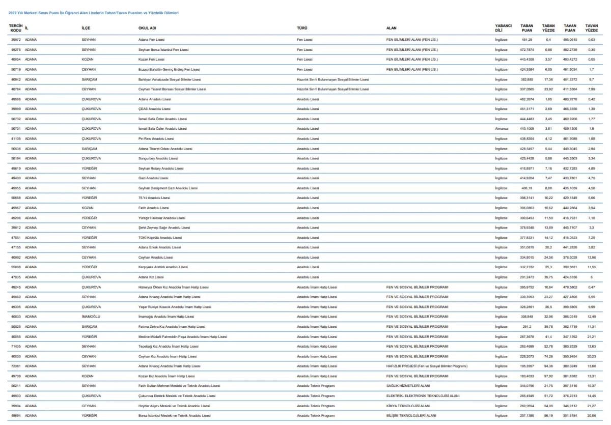 Geçtiğimiz yıl 2022 Yılı Merkezi Sınav Puanı İle Öğrenci Alan Liselerin Taban/Tavan Puanları ve Yüzdelik Dilimleri MEB tarafından yayımlanmıştı. İşte il il liselerin taban ve tavan puanları...