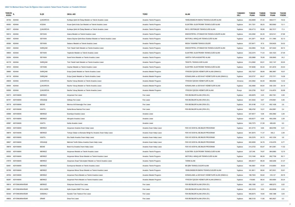 Anadolu Lisesi, Fen Lisesi, İmam Hatip Lisesi ve Meslek Lisesi taban puanları hakkında Milli Eğitim Bakanlığı tarafından yayınlanan kılavuz bilgileri her sene ilan ediliyor.