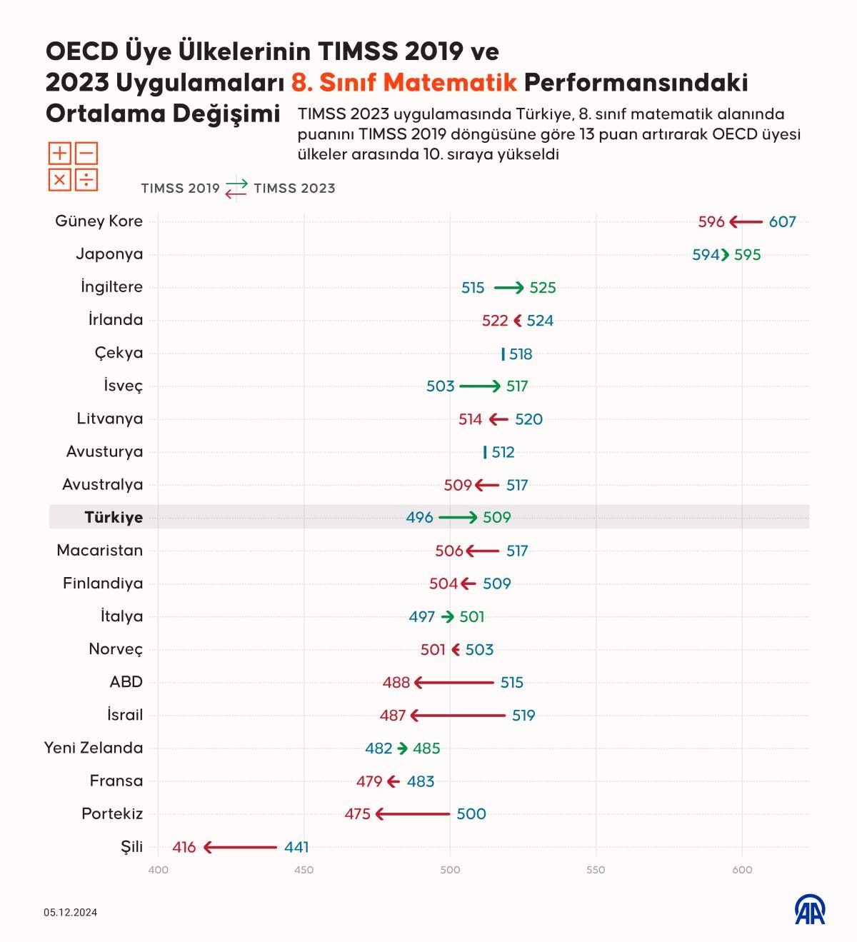 TIMSS 2023 uygulamasında Türkiye, 8'inci sınıf matematik alanında puanını 2019'a göre 13 puan artırdı.