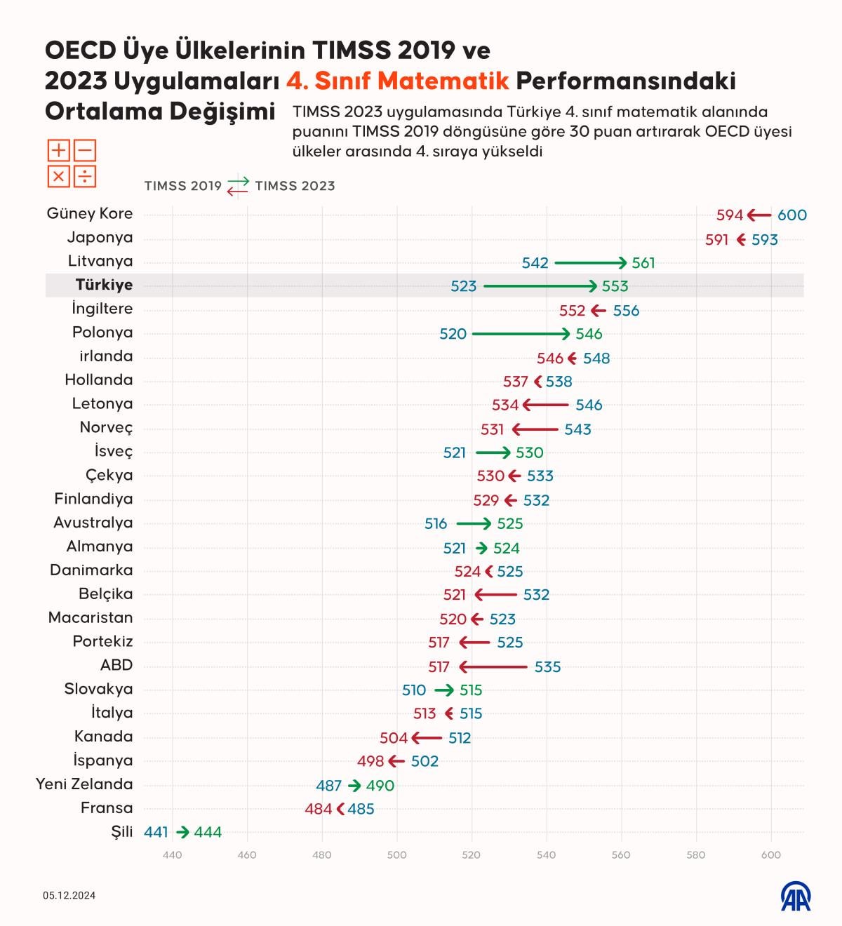 Bir önceki araştırmada 4'üncü sınıf matematik alanında dünya ortalamasında 23'üncü sırada bulunan Türkiye, TIMSS 2023'te 553 ortalama puanı ile 58 ülke arasında 8'inci sıraya yerleşti. Türkiye'nin TIMSS 2023 matematik puanı da 2019'a göre 30 puan arttı.