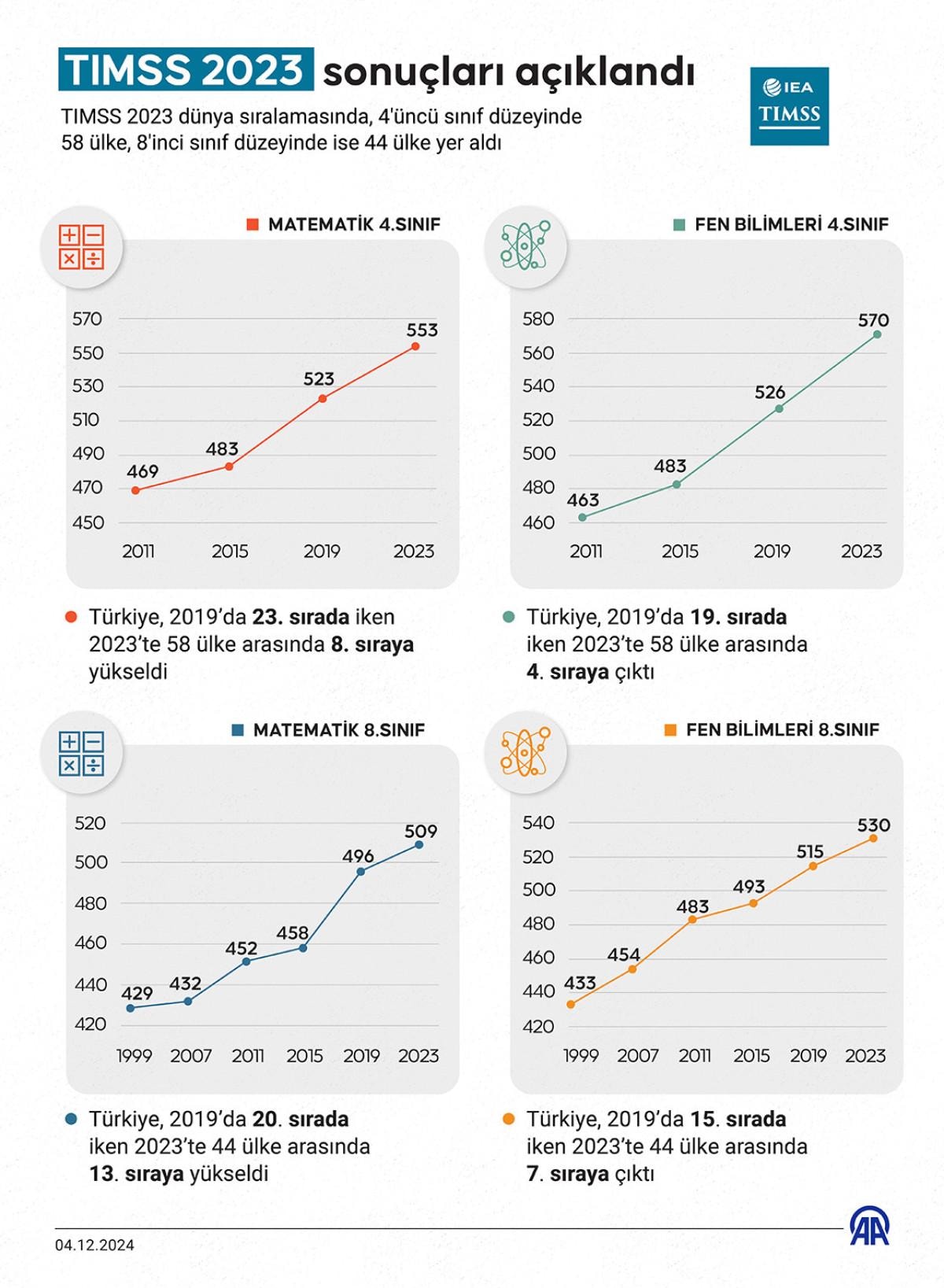 Türkiye, 2023 TIMSS sonuçlarına göre, ayrıca 44 puanlık artışla 4. sınıf “fen bilimleri”nde; uluslararası fen bilimleri ortalamasını geçti ve “Puanı en yüksek ilk 5 ülke”den biri oldu.
