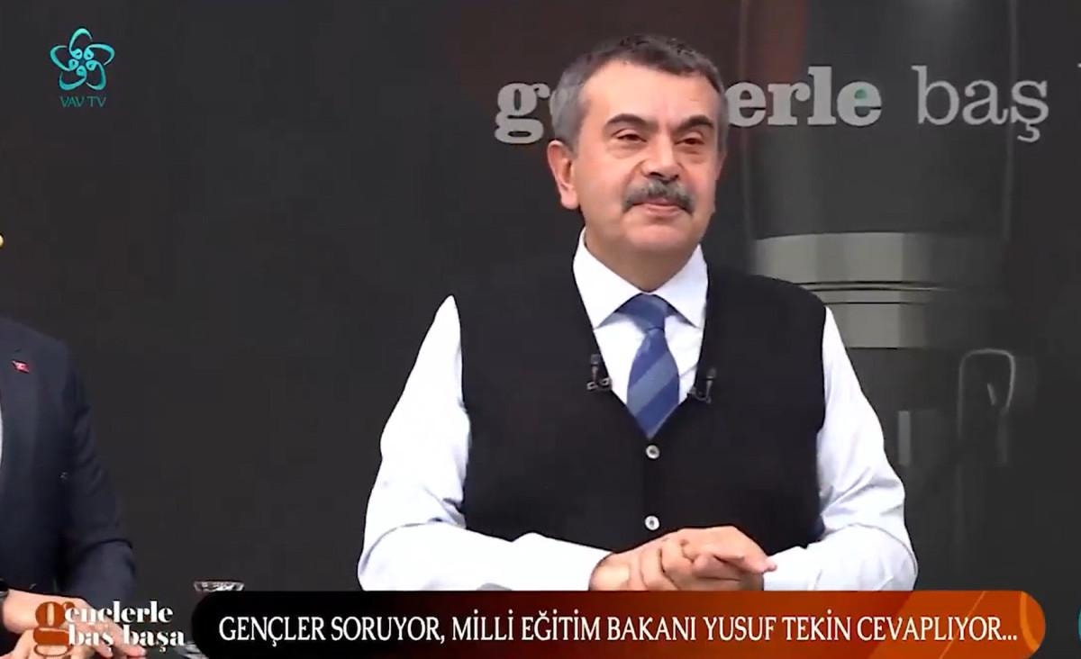 Milli Eğitim Bakanı Yusuf Tekin, Vav TV'de Hasan Basri Karadeniz'in moderatörlüğündeki "Gençlerle Baş Başa" programında soruları yanıtladı.