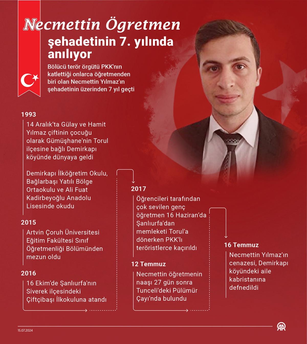 Yılmaz, oğlunun anısını yaşatmaya devam ettiklerini belirterek, "Evladımız Necmettin, peygamber mesleği olan öğretmenliği icra edebilmek, Urfa'daki çocuklarımıza yardımcı olabilmek adına elinden gelen çabayı gösterip nihayetinde de tatilini Gümüşhane'de memleketinde geçirmek için yola çıkmıştı. Ancak tatilini geçirmek üzere yola çıkan oğlum, maalesef asalaklar tarafından yolu kesilip alıkoyuldu ve şehit edildi." diye konuştu.