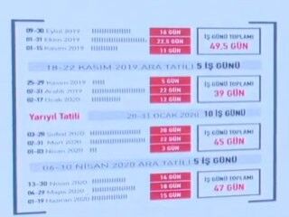 18-22 Kasım 2019 ve 6-10 Nisan 2020 ara tatil olarak planlandı. Bu tarihlerde öğretmenler görevlerine devam edecekler. Okullar açılmadan önceki 2 haftalık seminer dönemi, bu tarihlerde yapılacak."