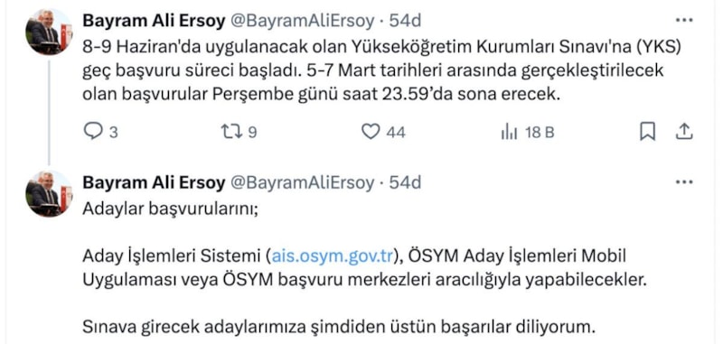 ÖSYM Başkanı Bayram Ali Ersoy, sosyal medya hesabından yaptığı açıklamada, "8-9 Haziran'da uygulanacak olan YKS'ye geç başvuru süreci başladı. 5-7 Mart tarihleri arasında gerçekleştirilecek olan başvurular, perşembe günü saat 23.59'da sona erecek. Adaylar başvurularını; Aday İşlemleri Sistemi (https://ais.osym.gov.tr), ÖSYM Aday İşlemleri Mobil Uygulaması veya ÖSYM başvuru merkezleri aracılığıyla yapabilecekler. Sınava girecek adaylarımıza şimdiden üstün başarılar diliyorum." dedi.