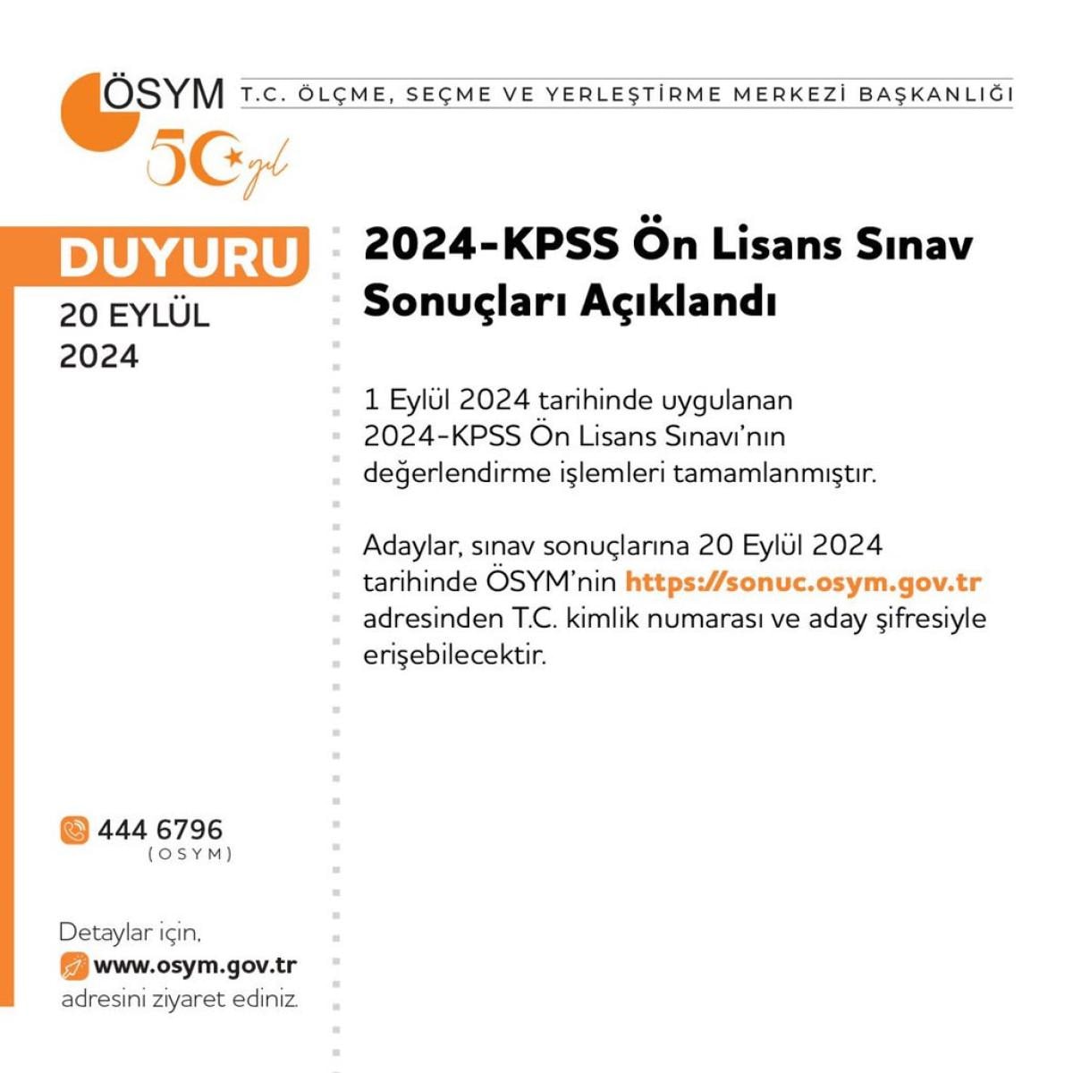 2024-KPSS Ön Lisans Sınav Sonuçları Açıklandı 1 Eylül 2024 tarihinde uygulanan 2024-KPSS Ön Lisans Sınavı’nın değerlendirme işlemleri tamamlanmıştır. Adaylar, sınav sonuçlarına 20 Eylül 2024 tarihinde saat 10.00’dan itibaren ÖSYM’nin https://sonuc.osym.gov.tr adresinden T.C. kimlik numarası ve aday şifresiyle erişebilecektir.