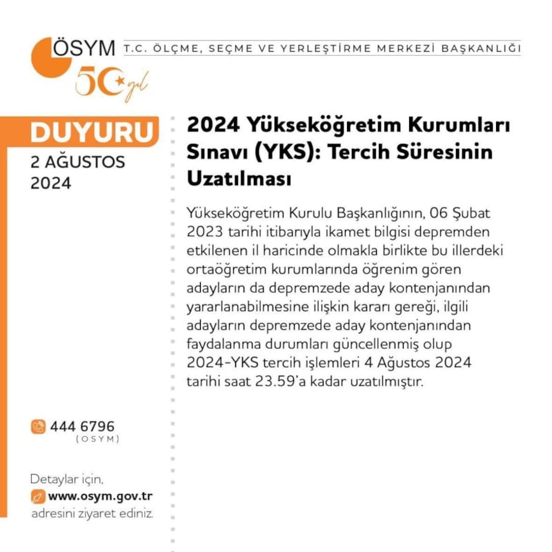 Yükseköğretim Kurulu Başkanlığı'nın, 6 Şubat 2023 tarihi itibarıyla ikamet bilgisi depremden etkilenen il haricinde olmakla birlikte bu illerdeki ortaöğretim kurumlarında öğrenim gören adayların da depremzede aday kontenjanından yararlanabilmesine ilişkin kararı gereği, ilgili adayların depremzede aday kontenjanından faydalanma durumları güncellenmiş olup 2024-YKS tercih işlemleri 4 Ağustos 2024 tarihi saat 23.59'a kadar uzatılmıştır.