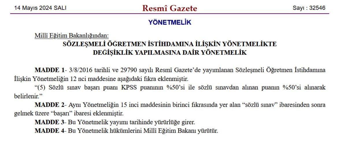 Yeni yönetmeliğe göre; sözleşmeli öğretmen istihdamında mülakat puanının, Kamu Personeli Seçme Sınavı (KPSS) puanının yüzde 50’si ile sözlü sınavdan alınan puanın yüzde 50’si alınarak belirlenmesine karar verildi.