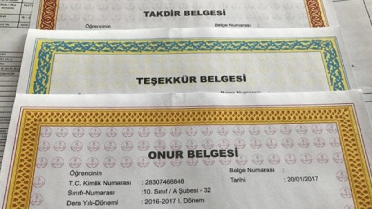 Buna göre okul öğrenci ödül ve disiplin kurulu, derslerdeki gayret ve başarılarıyla üstünlük gösteren, özürsüz devamsızlık süresi 5 günü geçmeyen, tüm derslerden başarılı olan, dönem puanlarının ağırlıklı ortalaması 70'ten aşağı olmayan ve davranış puanı 100 olan öğrencilerden, 70 ile 84.99 arasındakileri teşekkür belgesi, 85.00 ve daha yukarı olanları takdir belgesi, orta öğrenim süresince en az üç öğretim yılının bütün döneminde takdir belgesi alanları üstün başarı belgesi ile ödüllendirecek.