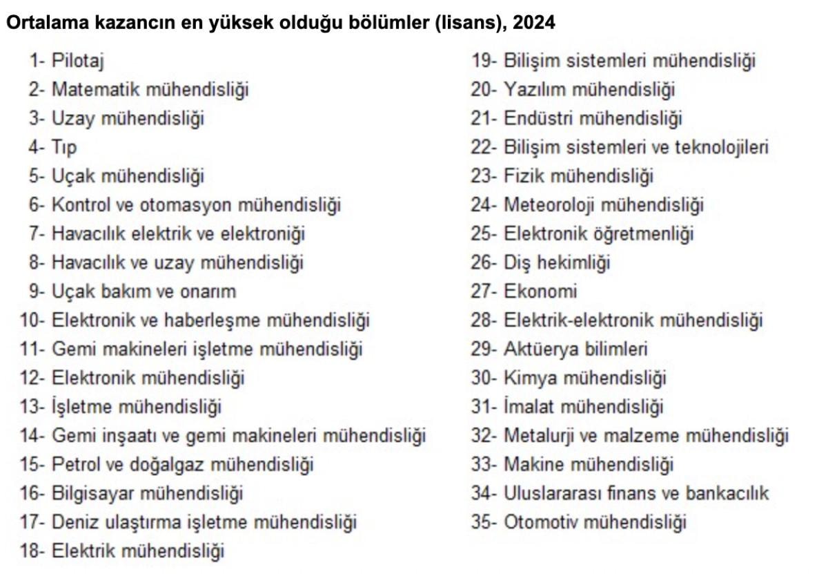 Lisans mezunlarında aylık ortalama kazancı en yüksek 5 bölümün sırasıyla pilotaj, matematik mühendisliği, uzay mühendisliği, tıp ve uçak mühendisliği olduğu görüldü.