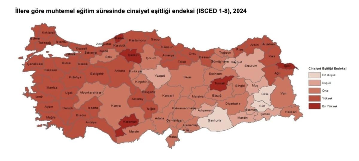 Muhtemel eğitim süresinin erkeklerde en düşük olduğu il olan Ağrı'yı, sırasıyla Şırnak, Muş, Şanlıurfa ve Mardin takip ederken; MES'in en düşük olduğu iller kadınlarda; Şanlıurfa, Şırnak, Muş, Ağrı ve Mardin oldu.