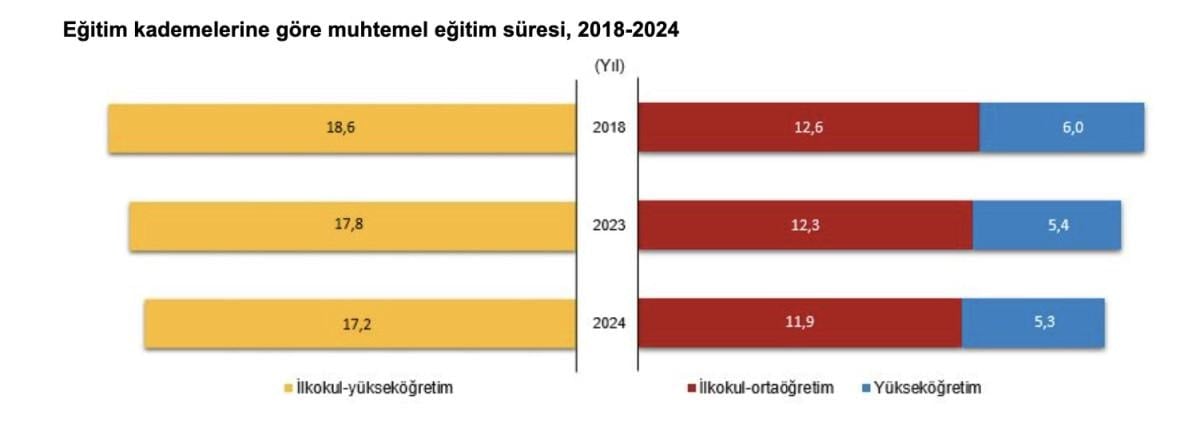 - Türkiye İstatistik Kurumu'nun verilerine göre, Türkiye'de 2024 yılında ilkokula başlayan bir bireyin eğitim hayatında geçireceği süre 17,2 yıl olarak hesaplandı.