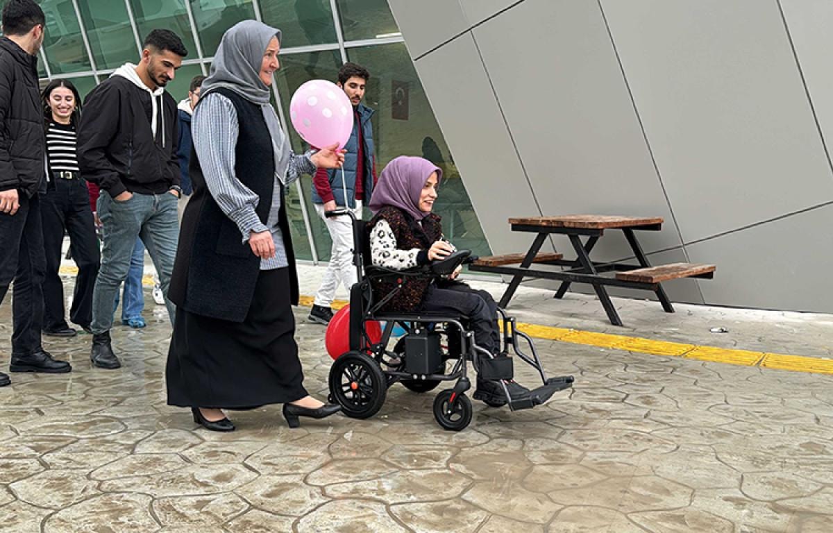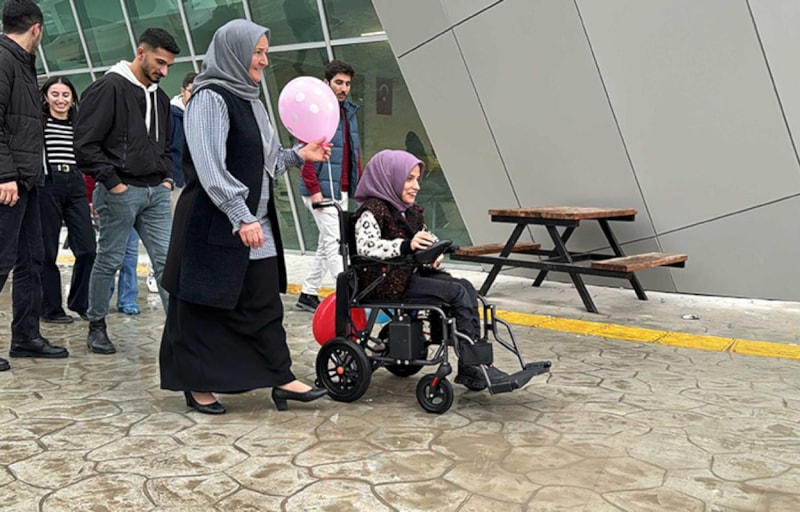 Eskiden tekerlekli sandalyem vardı ama birinin yardımına ihtiyaç duymadan dışarı çıkamıyordum. Şimdi artık özgürce dolaşabileceğim. Bu hediyeyi veren öğrencilere ve emeği geçen herkese çok teşekkür ediyorum.
