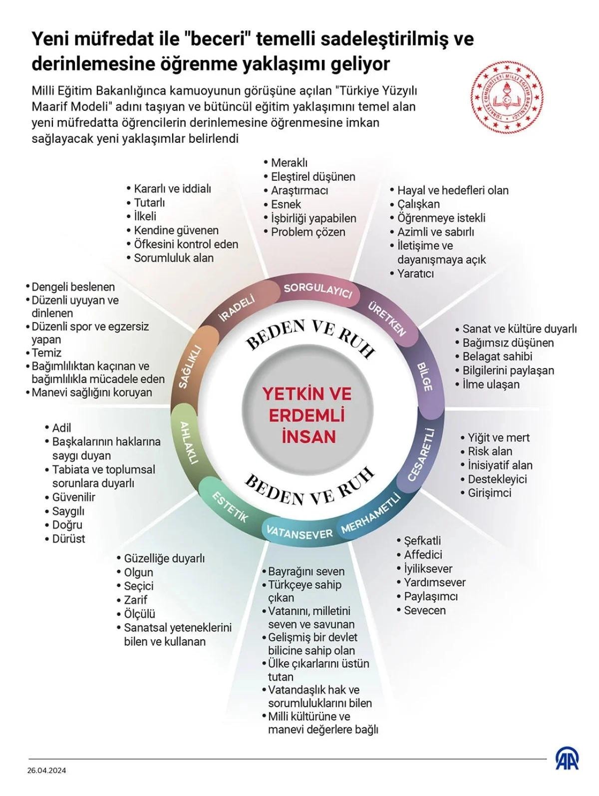Türkiye Yüzyılı Maarif Modeli'nde "bütüncül eğitim yaklaşımı" gereği bilgi, beceri, eğilim, tutum-davranışlar ile değerler ilişkilendirildi.