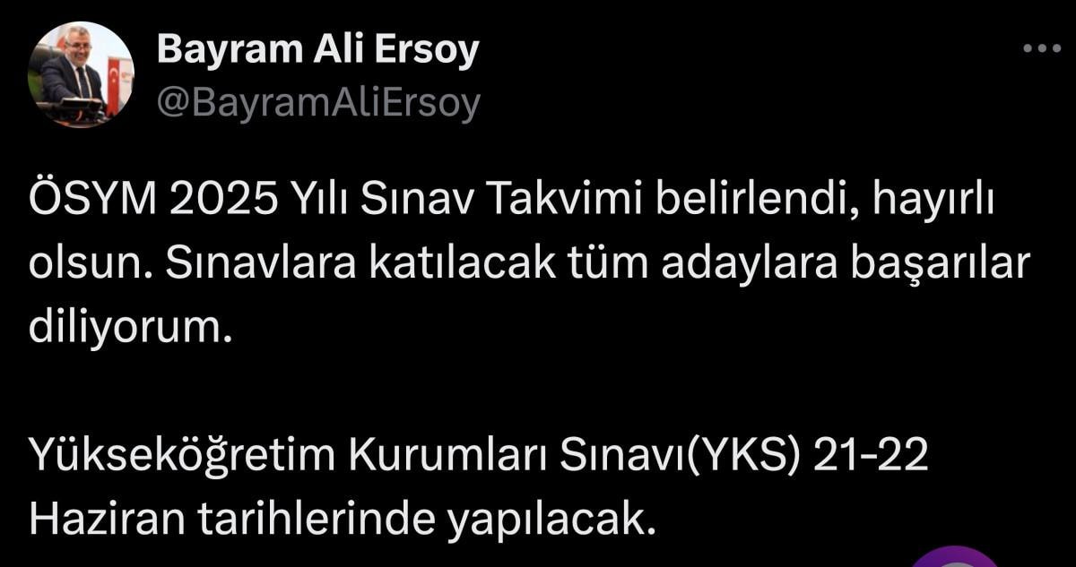 ÖSYM Başkanı Bayram Ali Ersoy, sosyal medya hesabından milyonlarca gencin beklediği son dakika haberini verdi. Ersoy, 2025 yılında yapılacak YKS'nin tarihini açıkladı.